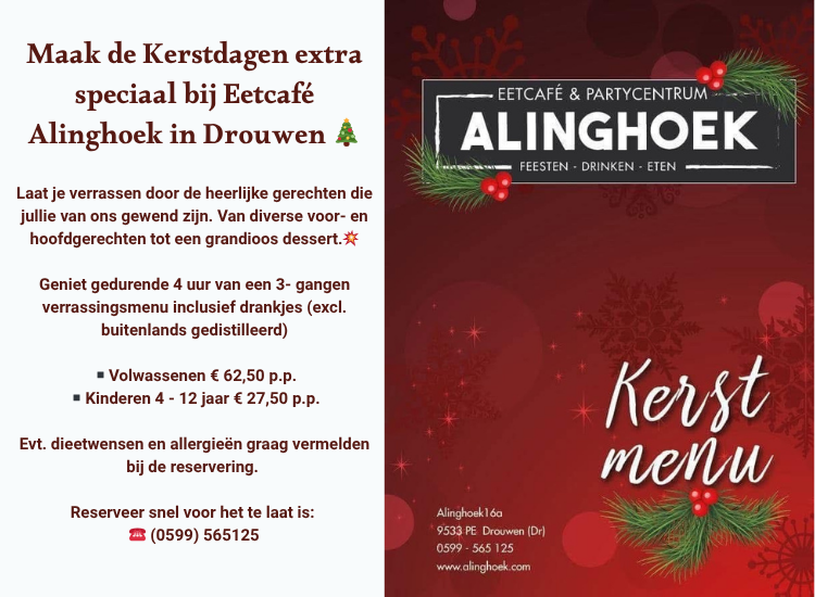 Ob Mittag- oder Abendessen oder etwas Leckeres für zwischendurch – im „Eetcafé Alinghoek“ kommen nur köstliche Dinge auf den Tisch. Die mit frischen (möglichst regionalen) Produkten zubereiteten Speisen servieren wir in unserem stilvollen Bistro oder draußen auf der Terrasse. Das „Eetcafé Alinghoek“ ist bekannt für seine leckeren Schnitzel und Spareribs. Kinder verputzen am liebsten unsere Pfannkuchen.